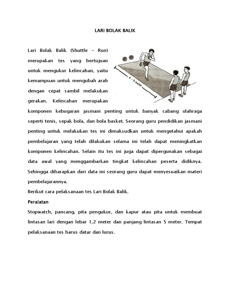 Cara melakukan lari bolak balik. Pos 2 lari bolak-balik suttle run dengan jarak 5 meter sebanyak 8 kali. Kelincahan merupakan komponen kebugaran jasmani penting untuk banyak cabang olahraga seperti tenis sepak bola dan bola basketSeorang guru pendidikan jasmani penting untuk melakukan tes ini dimaksudkan untuk mengetahui apakah. Kelincahan merupakan komponen kebugaran jasmani penting untuk banyak cabang olahraga seperti tenis sepak bola dan bola basketSeorang guru pendidikan jasmani penting untuk melakukan tes ini dimaksudkan untuk mengetahui apakah.