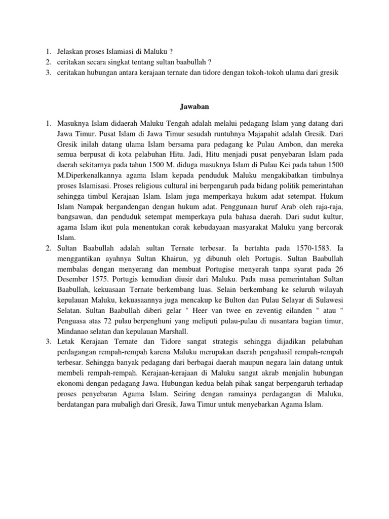 Ayah Sultan Baabullah adalah Sultan Khairun 1535-1570 juga merupakan Sultan Ternate. Pertanyaan Ceritakan secara singkat tentang Sultan Baabullah Jawaban - Kelompok Pelari o Nama Pertanyaan Dimana ibu kota kesultanan GowaTallo.