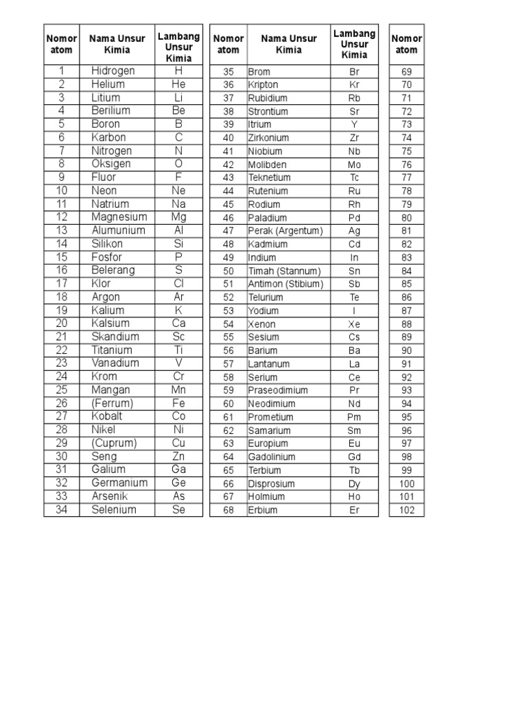 Merangkum dari Web Elements dan Lenntech berikut ini 118 unsur kimia lengkap. Hidrogen wujud secara bebas dan juga sebagai sebahagian daripada air bahan galian dan bahan organikHidrogen dibebaskan semula melalui elektrolisis air dan melalui pemprosesan petroleum. Unsur dan Senyawa Nomor atom - Nama unsur kimia - Simbol.