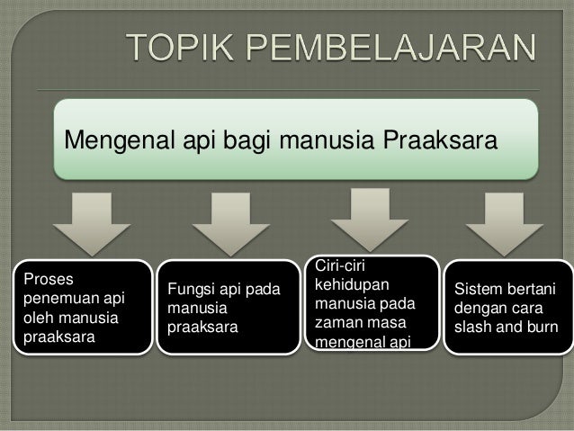 Setelah melihat tayangan gambar melalui power point dan melakukan diskusi peserta didik dapat menjelaskan berbagai manfaat atau fungsi api bagi manusia zaman Praaksara. Manfaat dan Bahaya Api Bagi Manusia. Penemuan pada periode manusia Homo erectus.