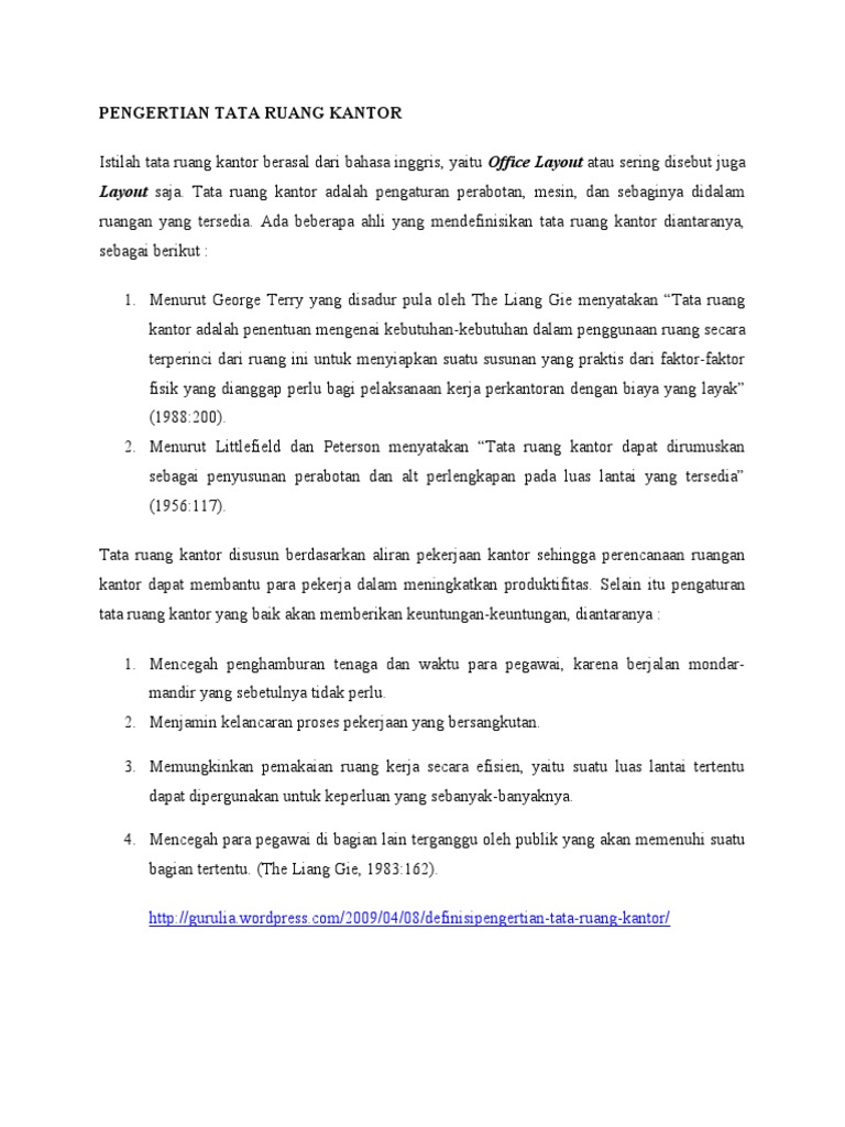 Ada beberapa ahli yang mendefinisikan tata ruang kantor diantaranya sebagai berikut. Unsur-unsur Administrasi PerkantoranMenurut The Liang Gie dalam buku. The Liang Gie b.