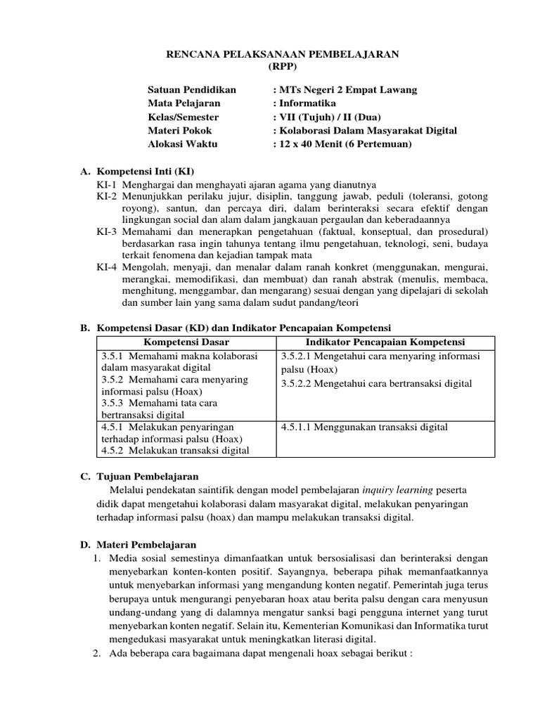 Rpp 1 Lembar Informatika Kelas Vii Smp Mts Semester Genap 2020 2021 Sinau Thewe Com