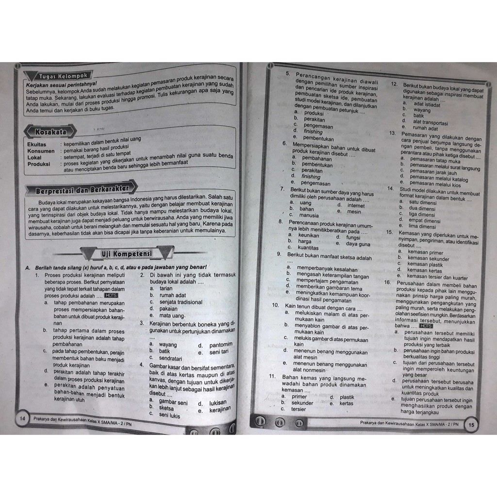 Bab 1 seperti soal tentang usaha dan produksi kerajinan berdasarkan kebutuhan pasar lokal serta evaluasi hasil perhitungan media promosi dan pemasaran produk kerajinan. Latihan nomor 101-110 untuk siswa SMAMA. KWU kelas XII Semester 1 kurikukulum 2013 Beserta JawabanPart11 - Melanjutkan postingan soal pilihan ganda prakarya K13 kelas 12 semester ganjil bagian ke-10 untuk siswa SMAMA latihan nomor 91-100 bagian ke-11 yang sedang anda baca ini berisikan materi yang sama Usaha Pengolahan Makanan Khas Daerah.